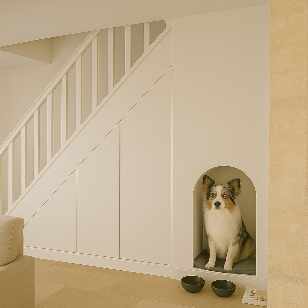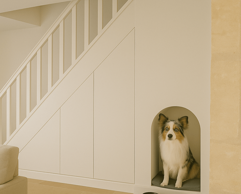 Aménagement sur mesure avec niche intégrée pour le chien, pensée comme un vrai cocon.